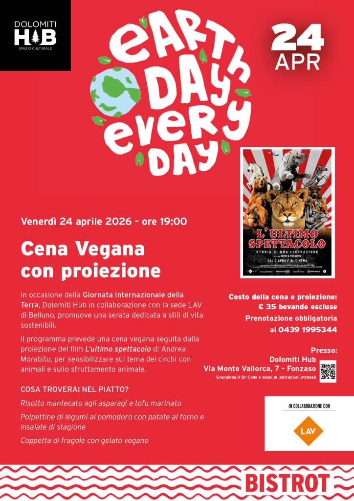 In occasione della Giornata Internazionale della Terra, celebrata ogni anno il 22 aprile, Dolomiti Hub, in collaborazione con la sede LAV di Belluno, propone una serata dedicata alla promozione di stili di vita sostenibili e consapevoli.