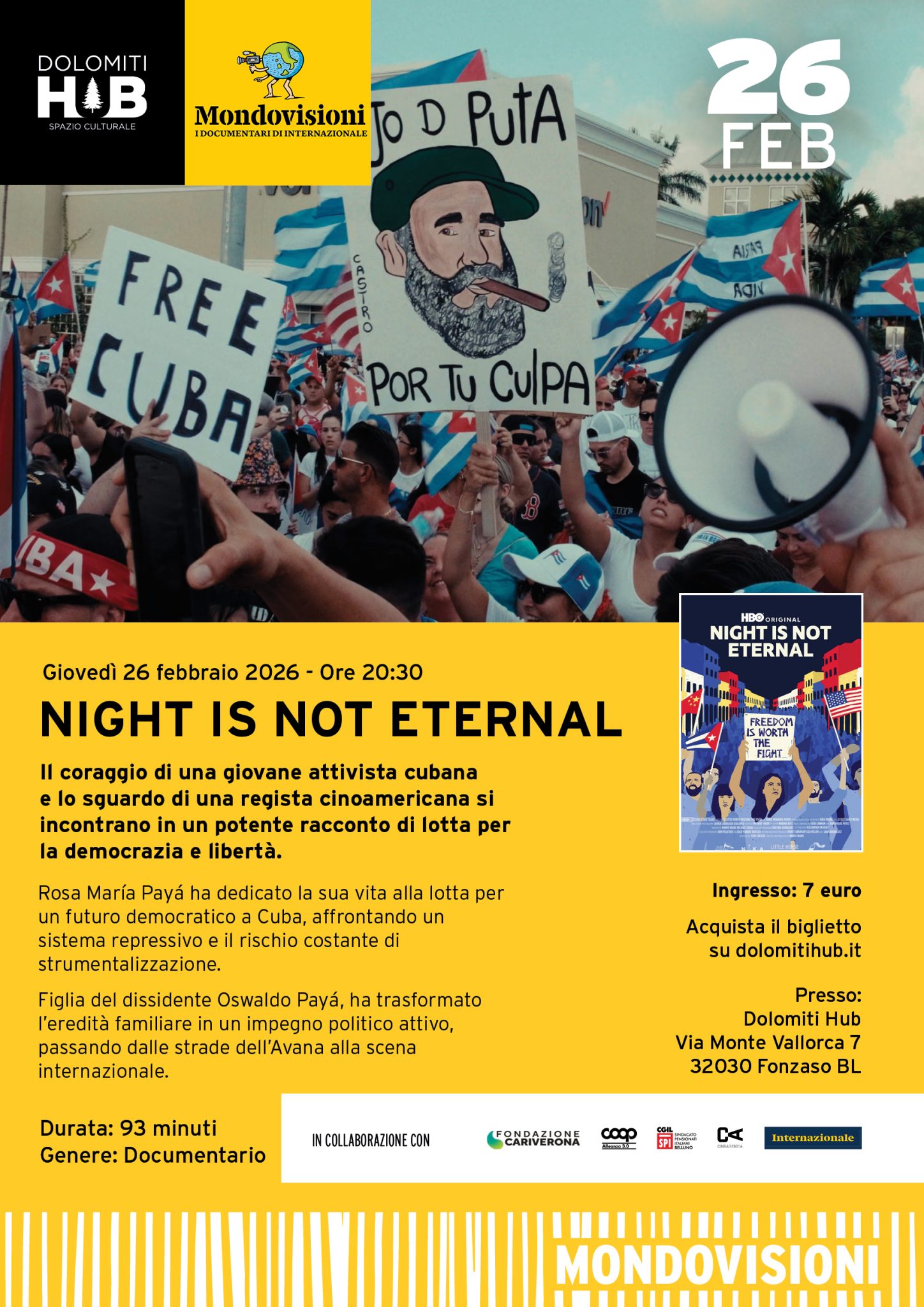 Un’appassionante storia di impegno politico attraverso lo sguardo della regista cinoamericana Nanfu Wang, che per sette anni ha seguito la giovane attivista cubana Rosa María Payá, figlia di Oswaldo Payá, cinque volte candidato al Premio Nobel per la Pace, nella sua lotta per il cambiamento democratico a Cuba. Spinta dalle sue esperienze in Cina, Nanfu è attratta dalla storia di Rosa e dai paralleli tra i loro paesi d’origine. Inizia così a seguirla dalle strade dell’Avana alle manifestazioni e conferenze in tutto il mondo, documentando la sua trasformazione da attivista di base a personaggio pubblico internazionale, e le sfide, scelte e compromessi con cui affronta e resiste a un regime. Le riflessioni di Nanfu sulla sua educazione cinese e sull’erosione dei principi democratici negli Stati Uniti, intrecciate alla vicenda di Rosa, rivelano inquietanti somiglianze tra Cuba, il sistema autoritario che la regista si è lasciata alle spalle, e quello che sta prendendo forma nel suo paese di adozione. Night Is Not Eternal è una potente riflessione sul senso dell’azione politica individuale contro ostacoli apparentemente insormontabili, e sul valore di una narrazione che supera i confini geografici per esplorare un desiderio universale di libertà.