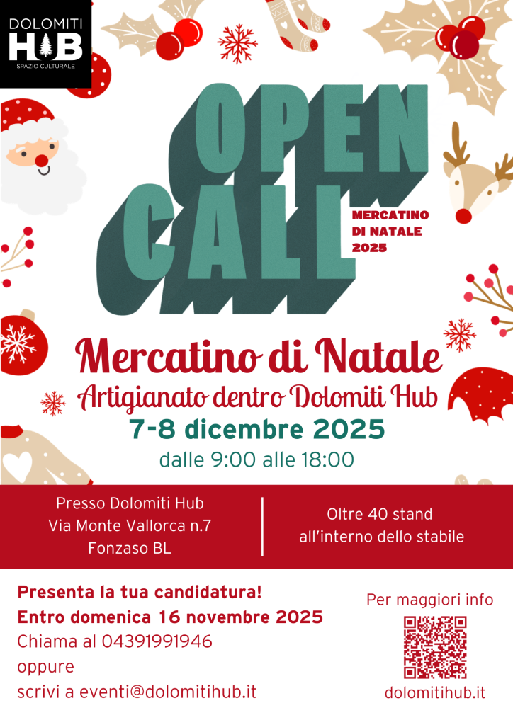 Dolomiti Hub, per la terza edizione, si trasforma in un mercato con bancarelle natalizie, in cui potrai vendere oggetti di artigianato, prodotti fatti a mano o realizzazioni creative.